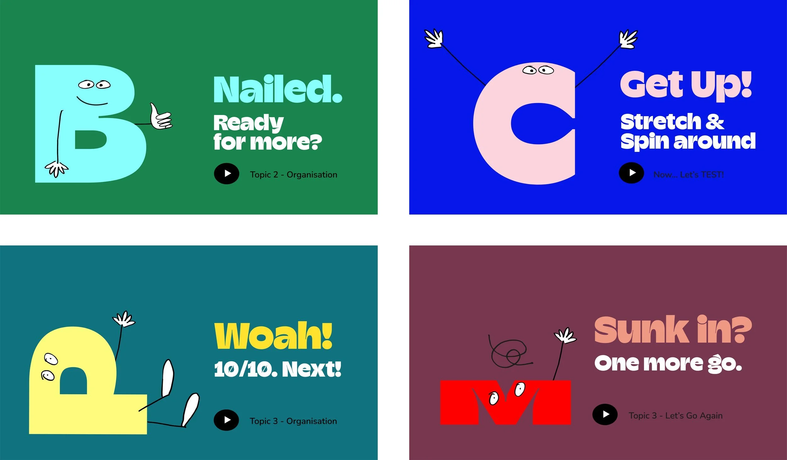 I kept the parts of the brand I thought were successful; personal and friendly. I then looked at a style of illustration/typography which borrowed the basic drawing style from the existing videos but used them differently and worked with some chunky type/characters. I added in fun messaging to engage and encourage the students.
