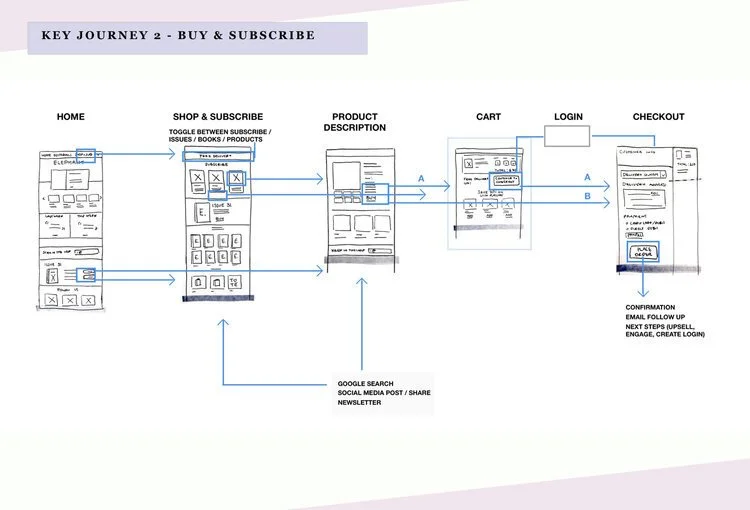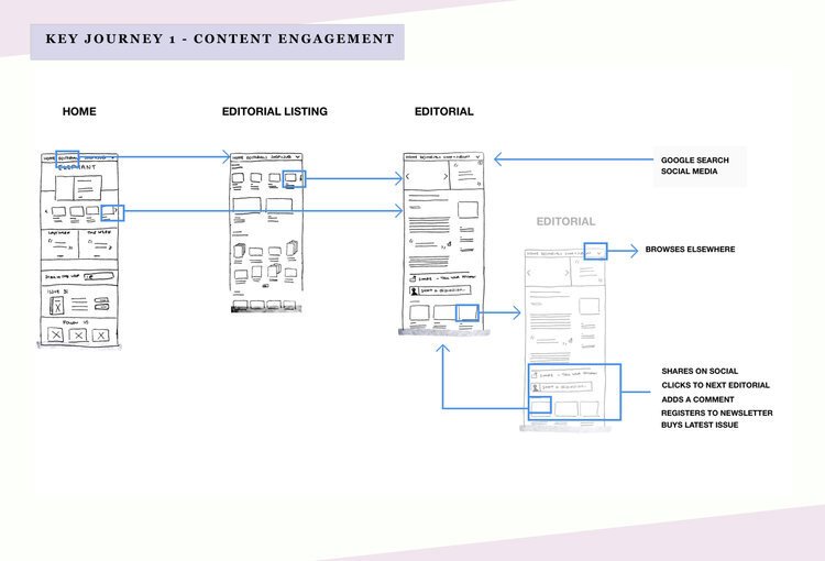 Georgia created 4 short stories to tell us about our users motivation, their specific goals and actions on our website. This enabled her to map out the key user journeys required within the business parameters to ‘engage users and drive subscriptions’. These user journeys drove the functional requirements of the site and several iterations of wireframes