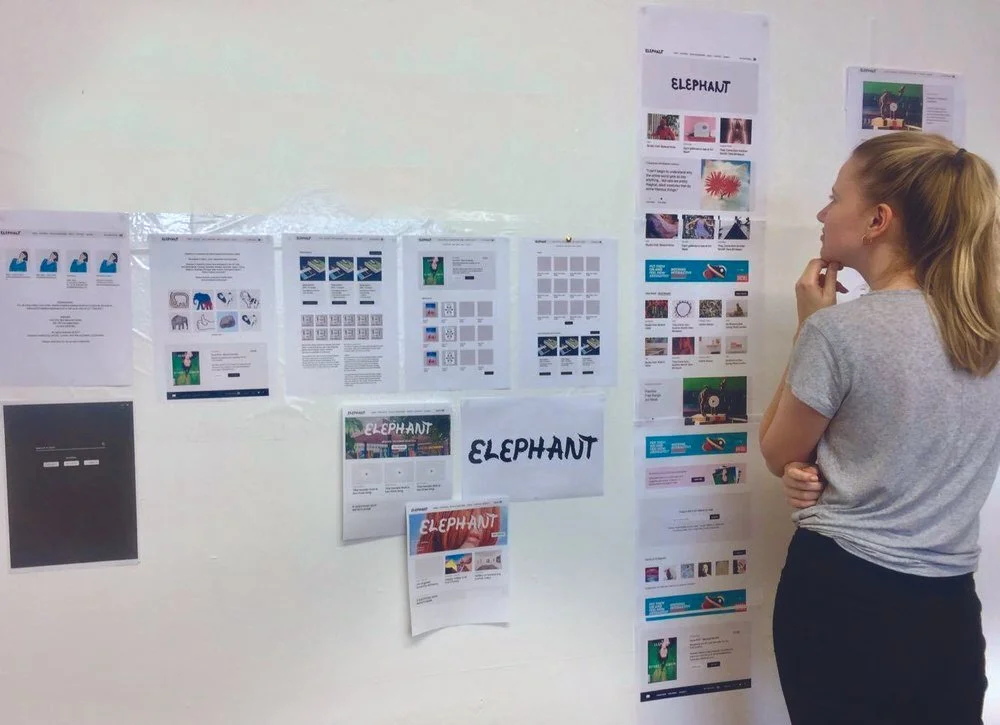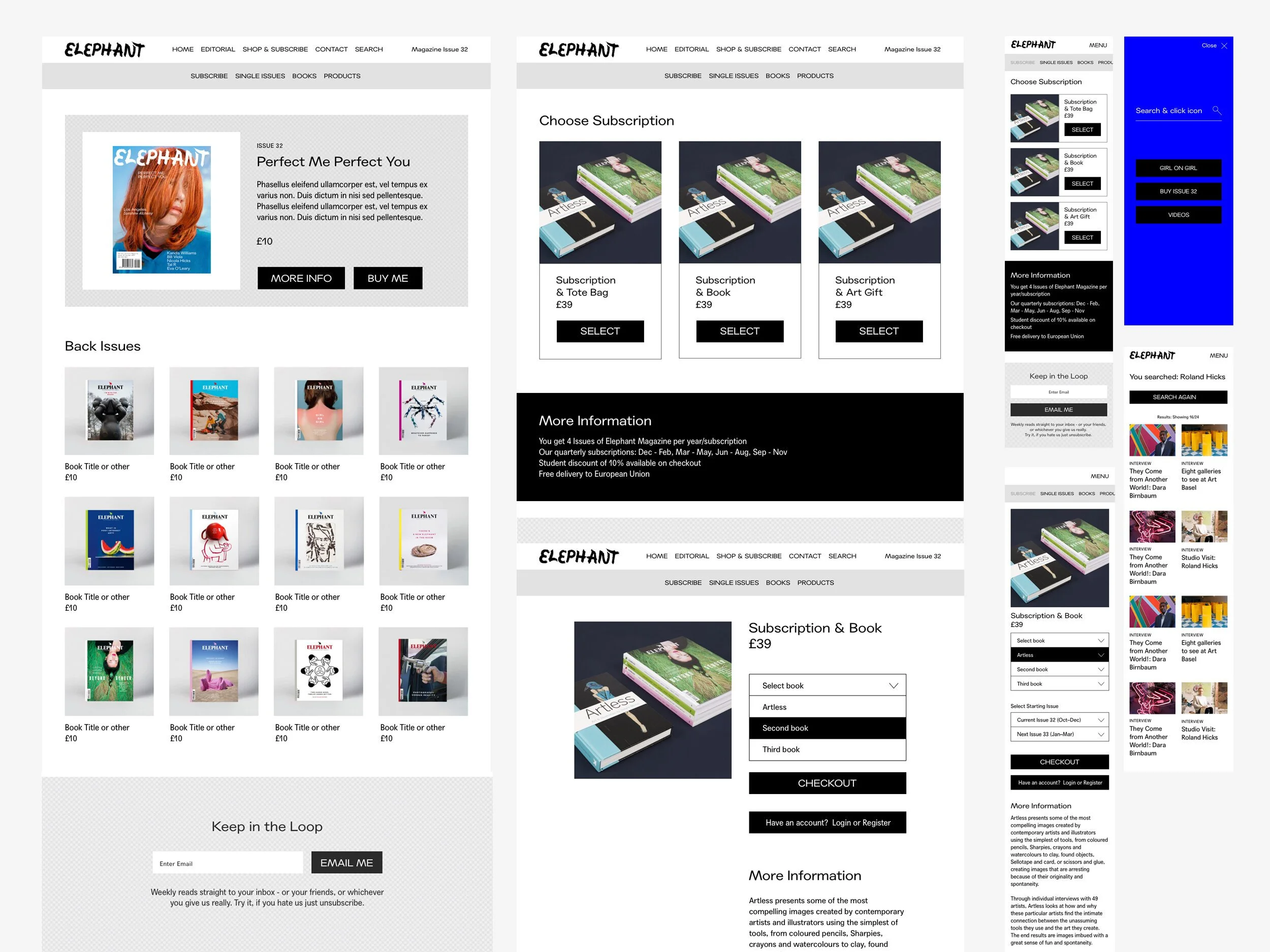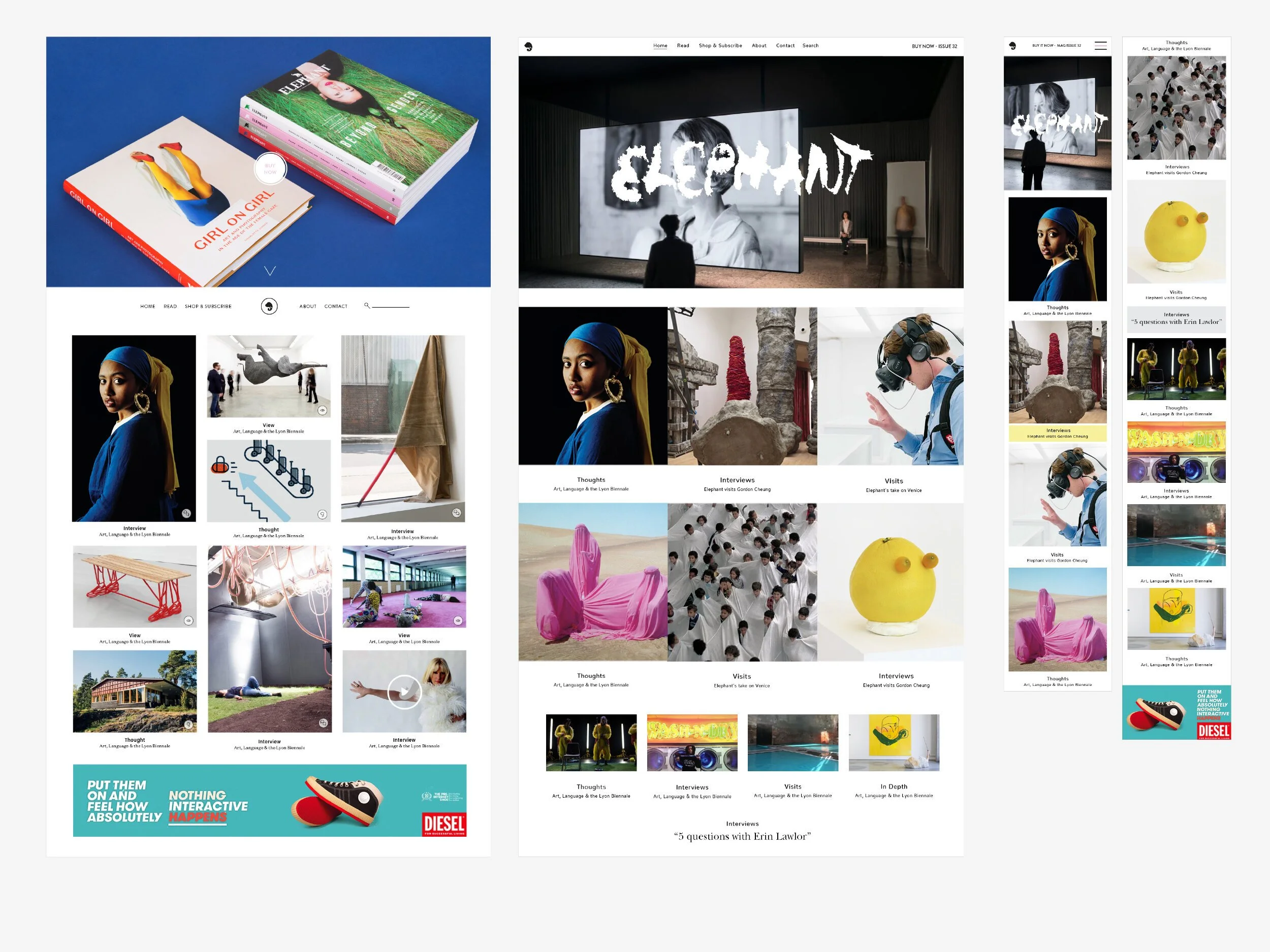 Homepage designs including modules like ‘5 questions’ which the editorial team could add or take away according to their content. The font introduced mimicked the magazine styling and on launch, the ‘Elephant’ logo dominated the top of the screen, whilst parallax scrolling in this area brought some subtle movement into the design.