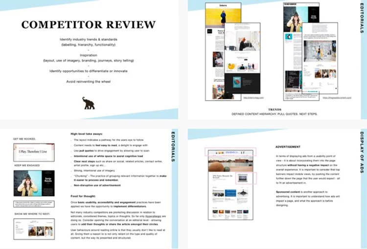 Georgia interviewed all the editorial team and a number of current users with the end goal of making the UX of the site work for both users and the team. She created a competitor audit to understand industry trends & standards, get inspired, identify opportunities for innovation or differentiation, and to avoid reinventing the wheel in the publishing and art worlds. This fed into how I would approach the UI.